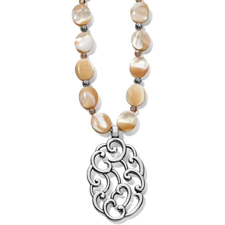 A dramatic oval pendant with airy swirls hangs from this long silver necklace adorned with Mother of Pearl beads in a warm, natural tan hue. In between, faceted fine quality crystals and etched silver beads add visual interest.