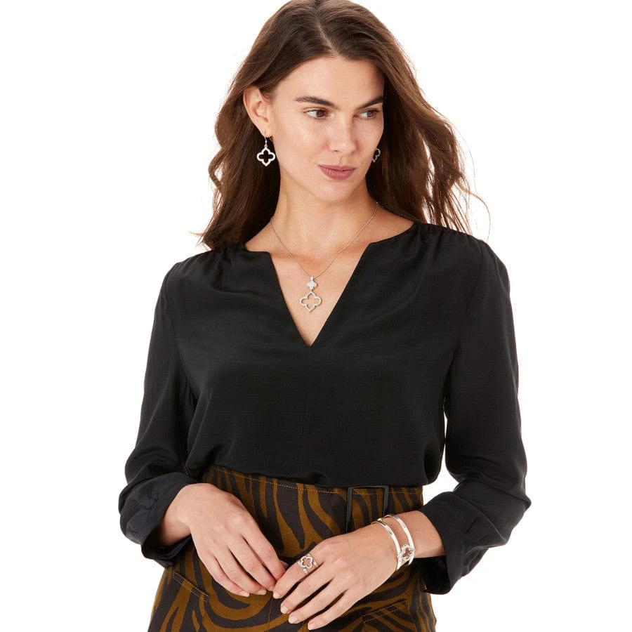 Embellished with a fine quality crystal-outlined arabesque, this elegant ring easily adjusts to your finger size.