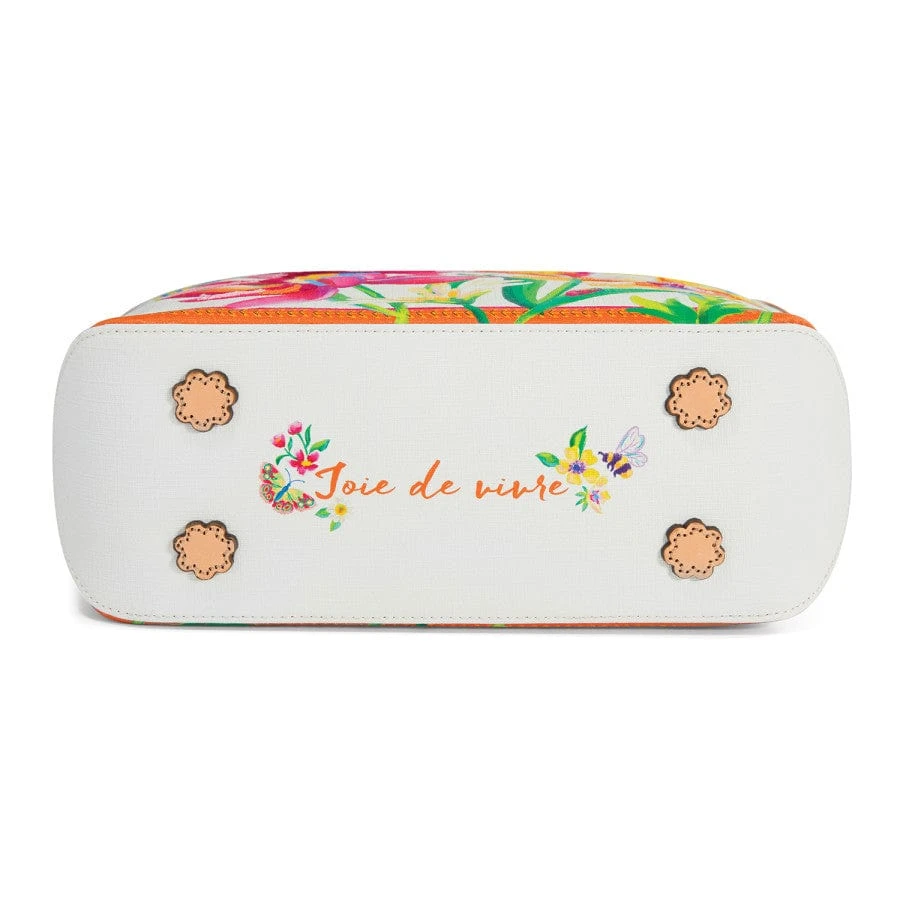 White saffian fabric is the canvas for painterly flowers and fluttering butterflies to pop against. For added texture and richness, there are 14,000 stitches of embroidery. A message on the bottom says, “Joie de vivre.”