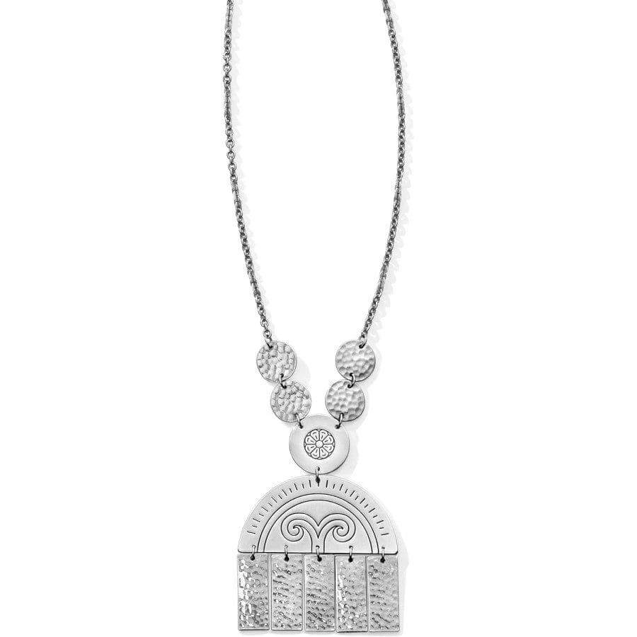 Like a sunrise on the horizon in Morocco, this long necklace, with its hammered design and etchings, shines with an earthy, boho feel.